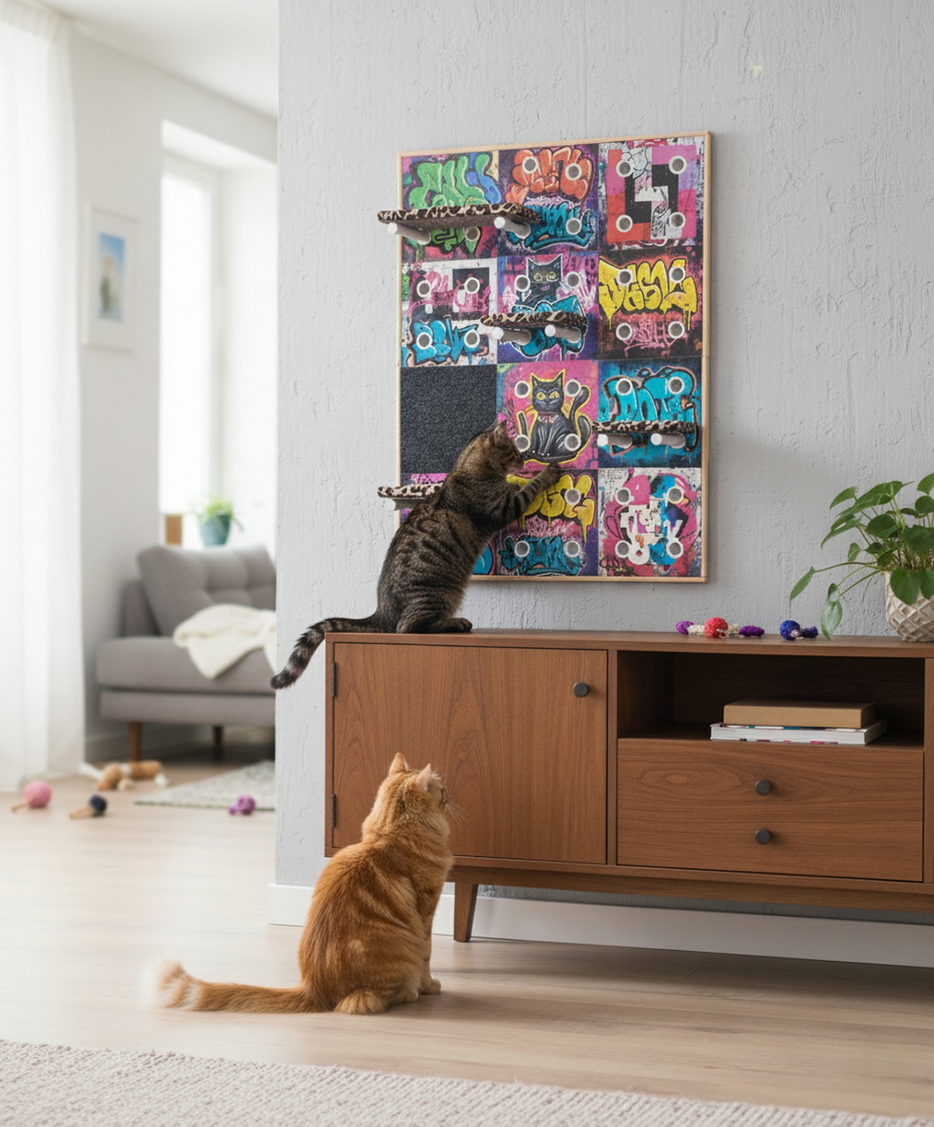 Chez WALLKAT CONCEPT, nous sommes spécialisés dans la fabrication artisanale d'arbre à chat mural de haute qualité. Nos produits offrent à votre compagnon un environnement stimulant pour jouer, grimper et se reposer.